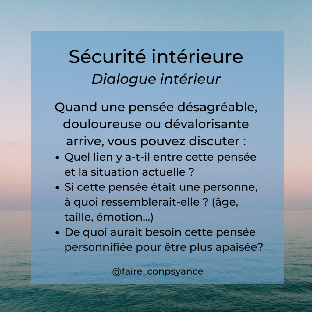 - La seconde étape pour mieux comprendre votre insécurité serait d’identifier ce que votre voix intérieure vous dit dans ces moments-là. Si vous laissez cette voix parler, qu’est-ce qu’elle vous dit ? Sur quoi parlent vos pensées ? Comment évoluent-elles au fil de la situation ? Qu’est-ce qui semble les apaiser ou les tendre davantage ? Essayer, du mieux que vous pouvez, d’analyser ce monologue intérieur dans tous les sens possibles. Cette phase peut devenir douloureuse, selon le type de pensées. Voyez-le comme un passage nécessaire pour reprendre la main sur ce qui vous arrive et ne plus subir ces pensées involontaires qui s’imposent à vous.